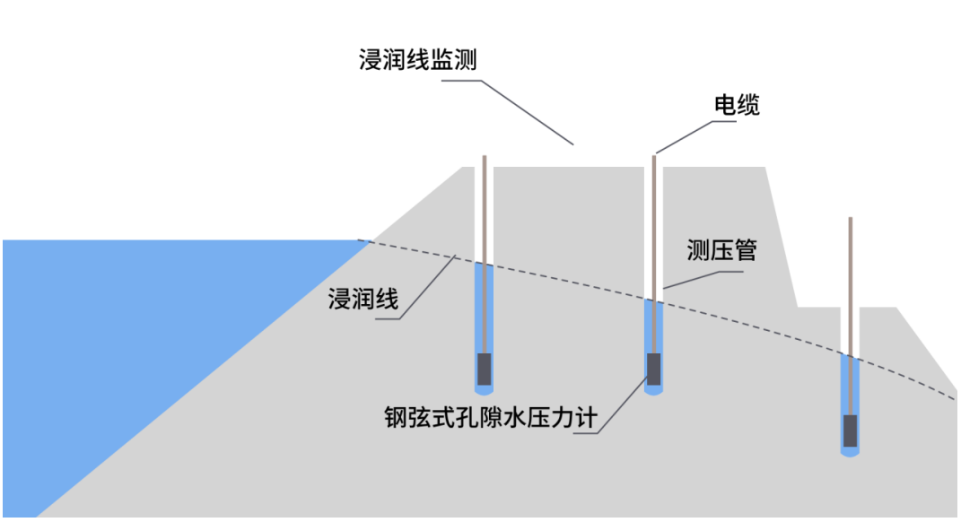 浸潤線是水從土壩(或土堤)迎水面,經(jīng)過壩體向下游滲透所形成的自由水面和壩體橫剖面的相交線。浸潤線是大壩安全的生命線,浸潤線的高度直接關系到壩體穩(wěn)定及安全性狀,當浸潤線埋深為0m,可產(chǎn)生管涌,是直接導致潰壩的原因。因此,對于浸潤線位置的監(jiān)測是水庫安全監(jiān)測的重要內(nèi)容之一。監(jiān)測時在壩體內(nèi)鉆孔埋設水位管,水位管內(nèi)放入孔隙水壓計,實時監(jiān)測測壓管內(nèi)水位,繪制浸潤面,判斷壩體內(nèi)水位的變化,結合理論分析,對壩體安全進行評估。